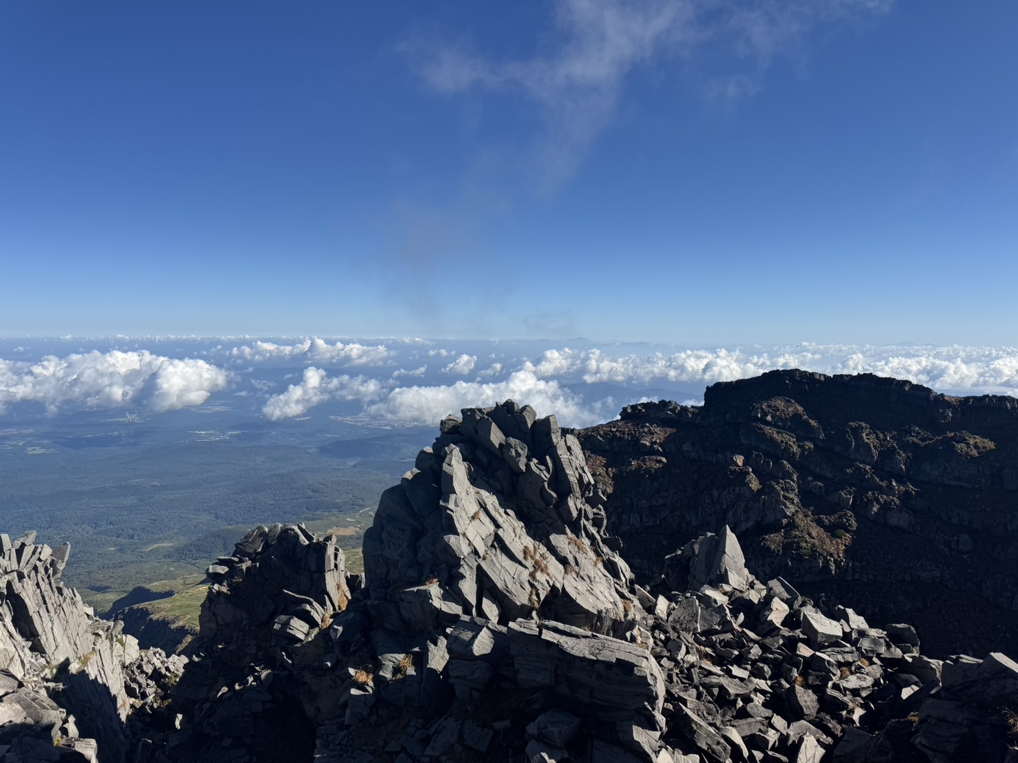 ☆山頂から今年は火山活動が盛んで登れない岩手山方面。突き出した溶岩が生々しい(^^;