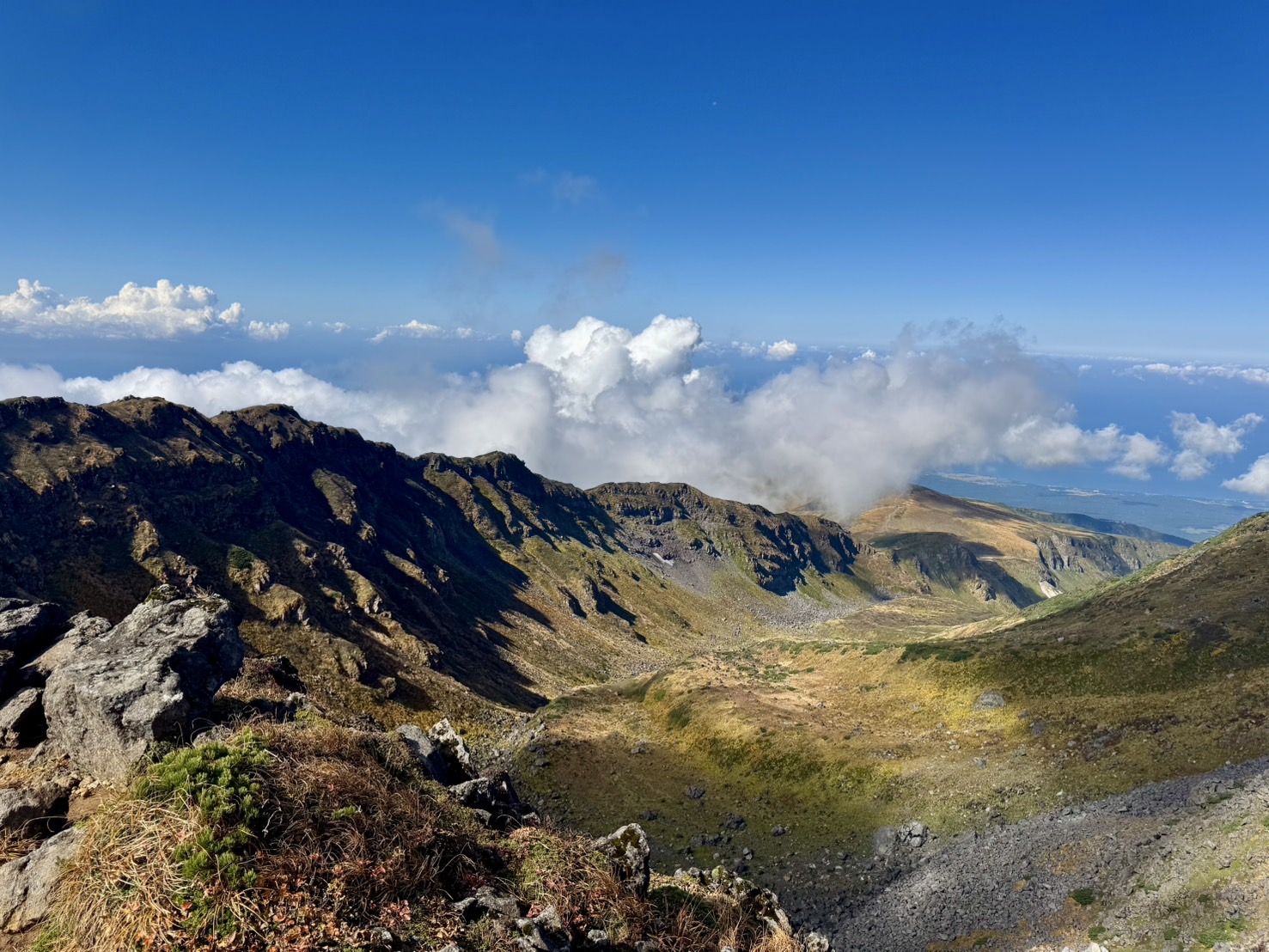 ☆外輪山と千蛇谷方面。10時頃には雲に包まれました(^^;