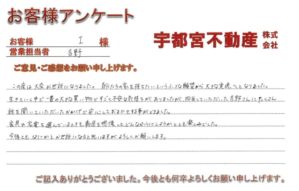 この度は数ある中から当社にお問い合わせ、ご契約頂きありがとうございました。 初めてのマイホーム探しは、わからないことも多くご不安な事も最初はたくさんあったかと思いますが少しでも解消のお手伝いができた様でしたら光栄です。 ご両親にもご納得いただけた素敵なおうちだと思いますので、これから新しいご家族と今まで以上に素敵な新生活をお過ごしください。 お忙しい中ご記入いただきありがとうございました。
