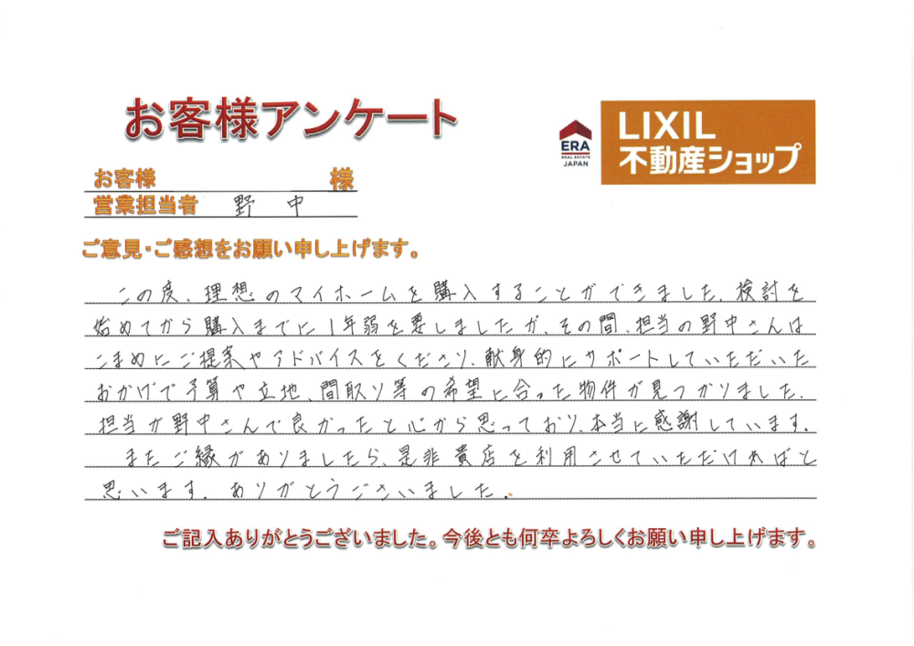 この度は、住宅のご購入おめでとうございます!! 二人三脚のように走り抜けた数か月でしたね。 お付き合いくださり誠にありがとうございました。 ご家族の息の合った相性の良さが伝わり、ほっこり感じておりました。 これからも末永く、お健やかにお過ごしください! この度は、宇都宮不動産おご利用いただき誠にありがとうございました。