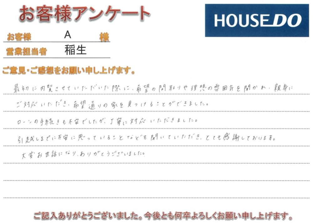 新しいお住まいでの生活が、A様にとって笑顔の絶えない素晴らしいものになりますよう心よりお祈り申し上げます。 今後も何かお困りごとがございましたら、いつでもお気軽にご連絡ください。 末永いお付き合いのほど、よろしくお願い申し上げます。
