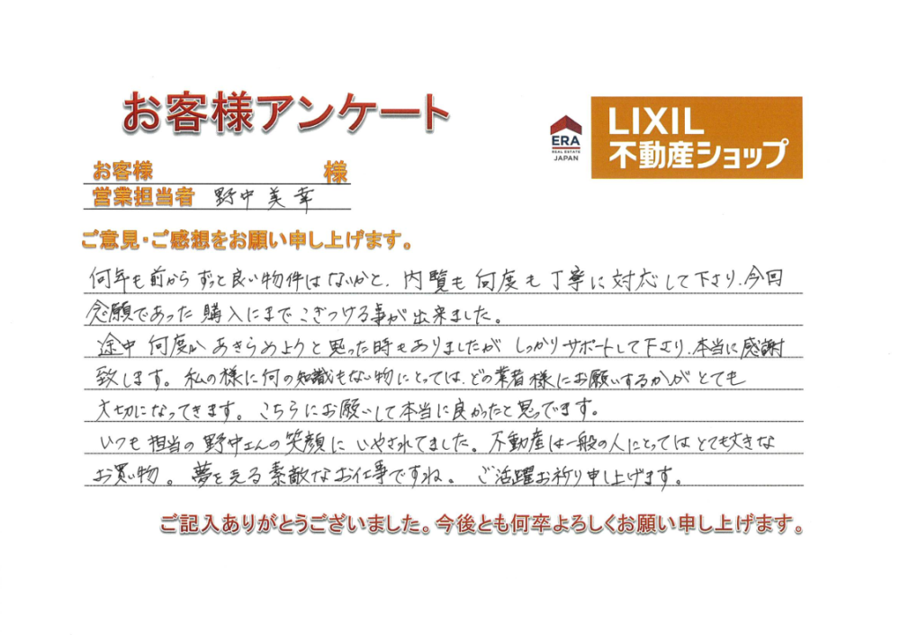 この度は、マンションのご購入おめでとうございます! お手続きやご決断の機会が何度もあり、お気持ち的にもたいへんだったかと思います。 お付き合いくださり、ありがとうございました。 何年も考えていらしたことや、ご購入の理由を聞いて、どうか形にできるよう応援しておりました。 無事にお引渡しができ、とても嬉しく思っております。 この度は、宇都宮不動産をご利用いただき誠にありがとうございました。
