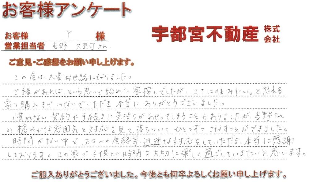 この度は数ある中から当社 宇都宮不動産にお問い合せ頂きありがとうございました。 最初にお問い合わせを頂いた物件が決まってしまったりなどございましたが、最終的に一番良い形での物件をご紹介することができ本当に良かったです! 物件の動きも早い時期でもありましたが、その中でお忙しい中すぐにご対応いただいたりなどご協力頂きありがとうございました。 Y様やご両親にとっても一番良い形で、お家のお話も進めることもでき、これからはお子様やお近くにお住まいのご両親なども新居に来て頂いて、たくさん遊べるかと思いますので今まで以上に楽しくお過ごし頂ければ幸いです。 お忙しい中ありがとうございました!