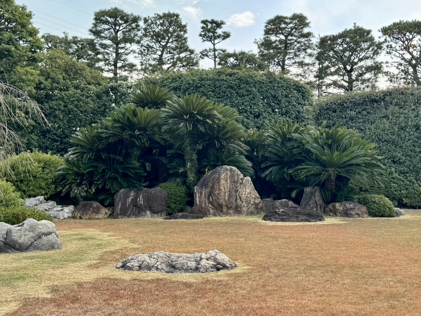 ☆桃山の庭。波濤のような生垣や蘇鉄を植樹した芝庭はいかにも大名庭園といった感じ。