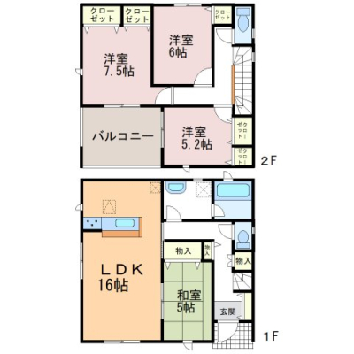 ◇ゆとりある居住空間♪1階には家族が集う16.2帖の広々としたLDKに加え、客間や家事スペースとして重宝する5帖の和室を配置した使い勝手の良い4LDKです。 ◇充実の収納とプライベート空間♪2階の全居室にはクローゼットを完備。特に主寝室は8.7帖とゆとりがあります。 ◇利便性の高い外構♪前面道路は幅員5m〜6mとゆとりがあり、並列で2台分のカースペースを確保。